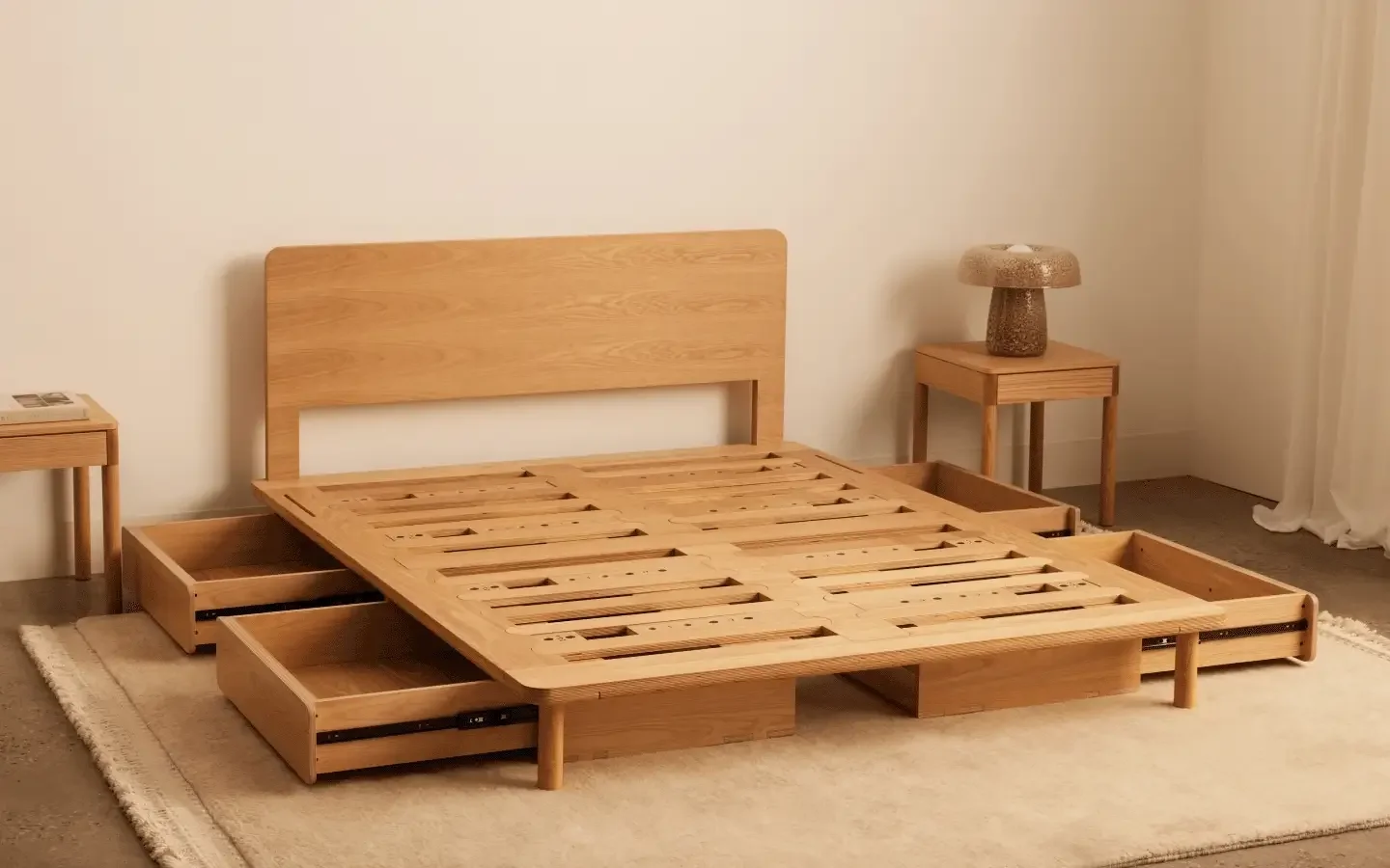 The rug should extend beyond your nightstands. It frames the entire sleep zone, not just the bed.