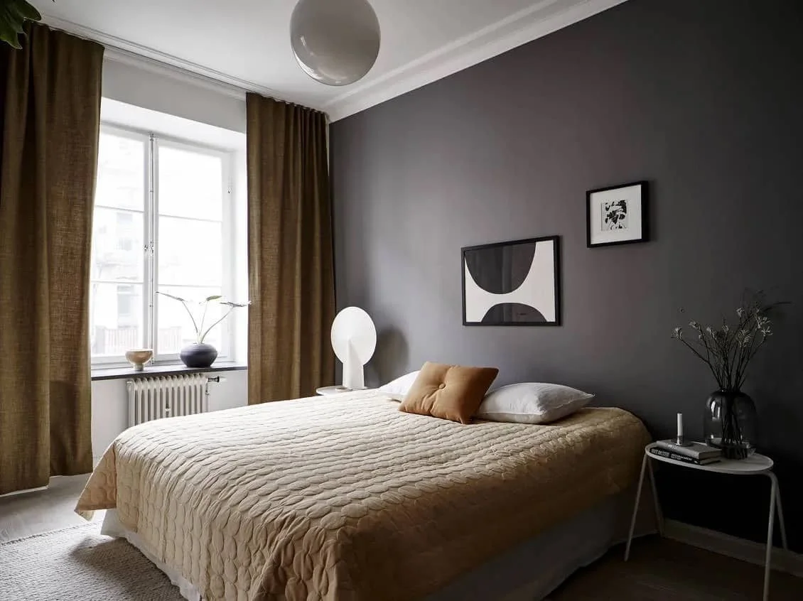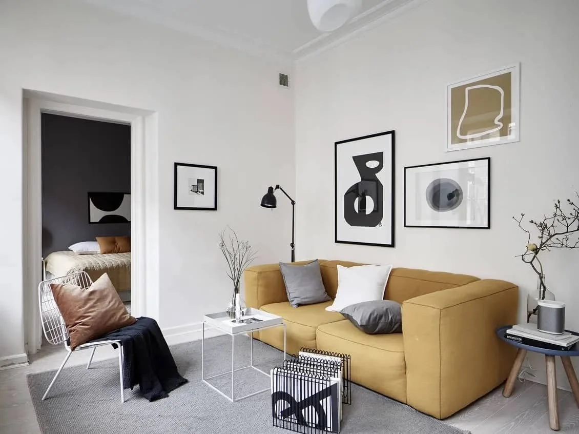 In the bedroom, the mustard bedspread pairs perfectly with dark grey walls. In the living room, bam – mustard sofa against bright white walls.